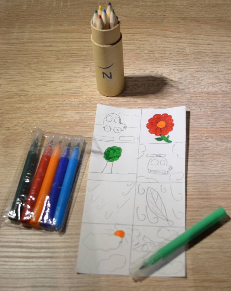 Stap6: Kleur de prenten in met de kleurpotloden en de stiften.