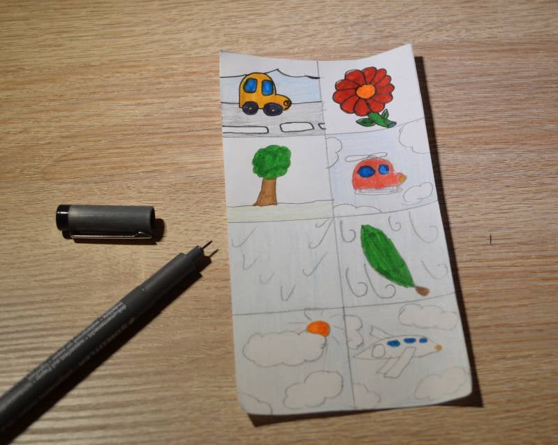 Stap7: Ga met je zwarte stiftje over de lijnen van je tekeningen. Doe dit ook met de lijnen die de vakjes indelen.