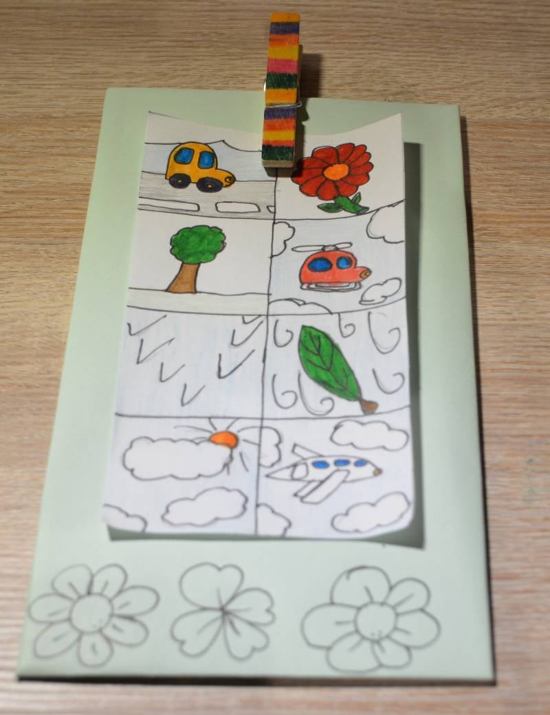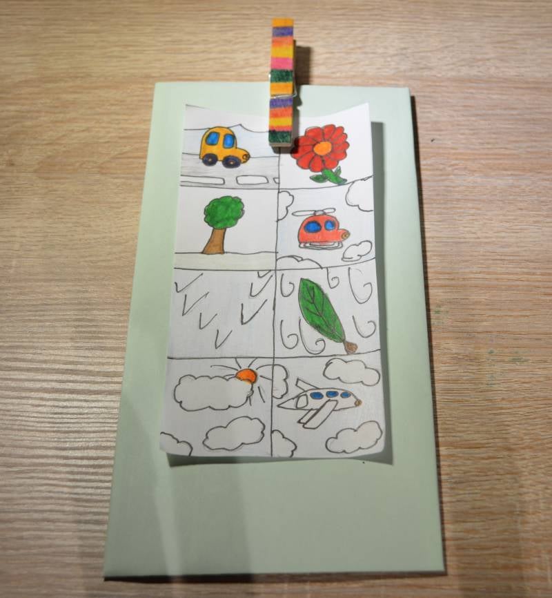 Stap9: Speld met de wasknijper de prenten op het karton.