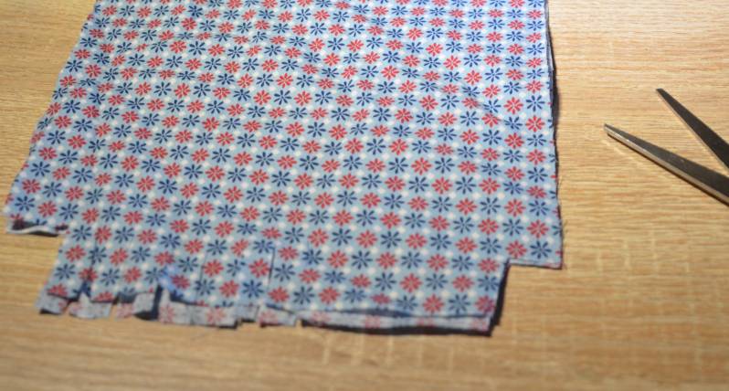 Stap3: Tussen de uitgeknipte vierkanten knip je strookjes die aan de rest van de stof vasthangen. Doe dit met de vier zijkanten.