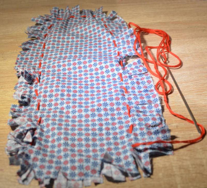Stap6: Naai de laatste zijde ook toe met de rechte steek. Ook nu weer maak je geen knoopje en knip je ook de draad niet af.