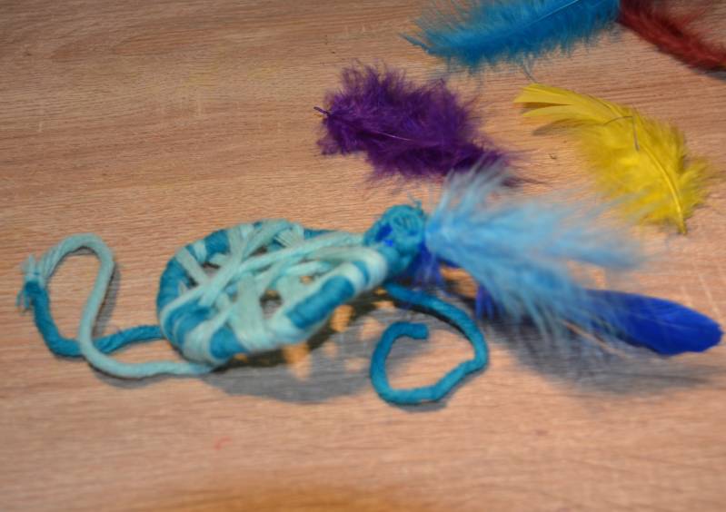Stap14: Nu maak je aan de onderkant een paar veren vast. Dit kun je doen met een stuk wol.
