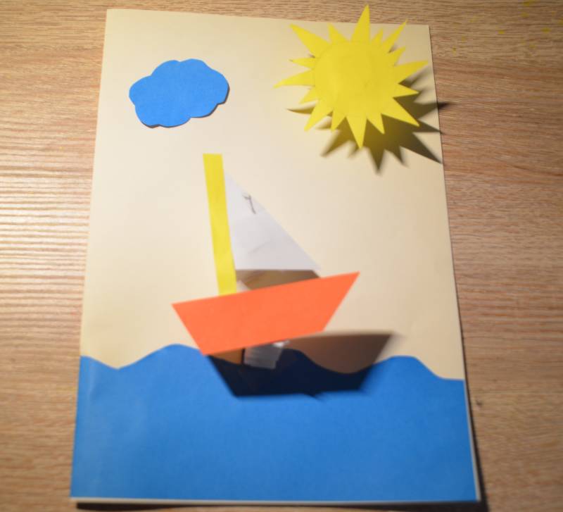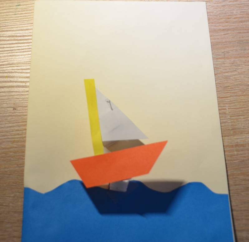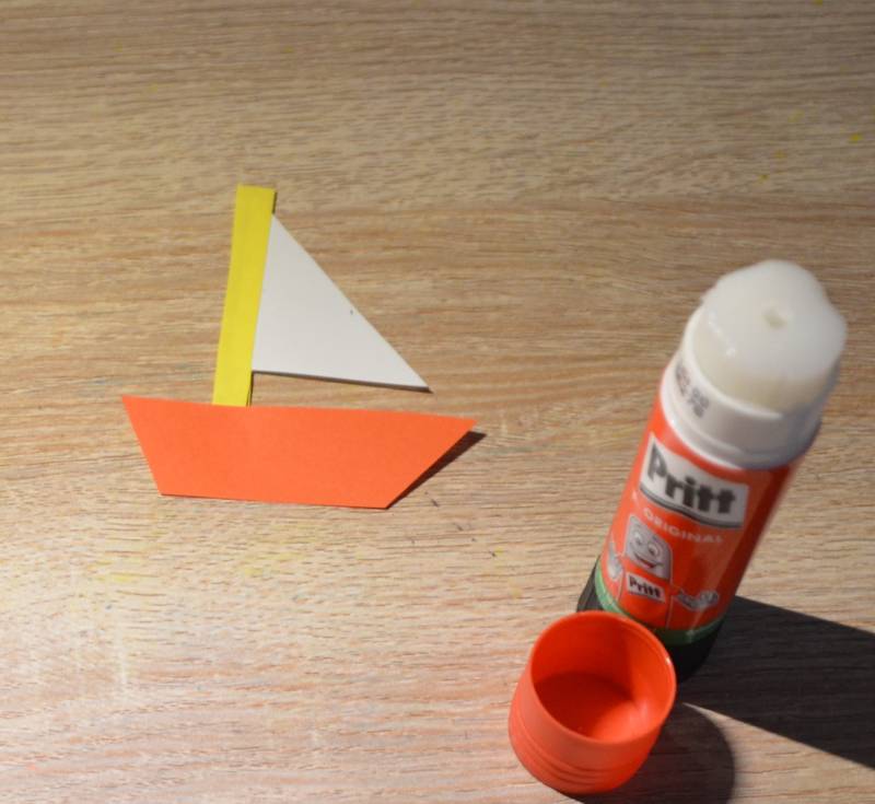 Stap5: Plak de vormen aan elkaar met lijm zodat je een bootje krijgt.