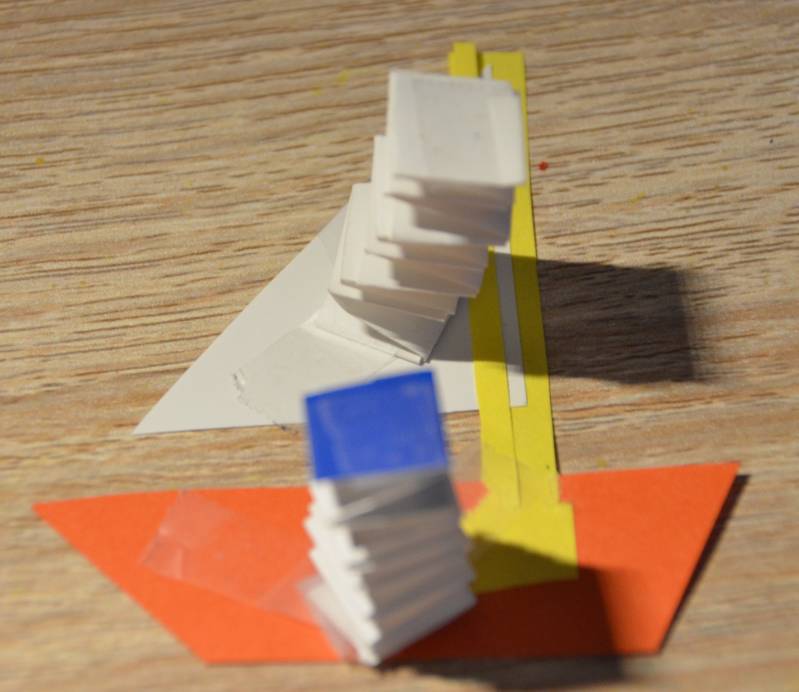 Stap4: Knip van het witte blad een rechthoekige driehoek, van het gele blad een smalle rechthoek en van het rode blad een trapezium.