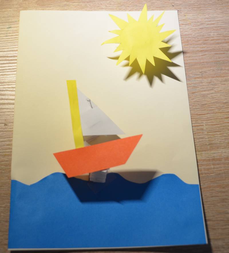 Stap14: Plak met de onderkant van de veren de boot op de bovenkant van de golven aan de voorkant van de kaart. Zo kan de boot een beetje stuiteren.