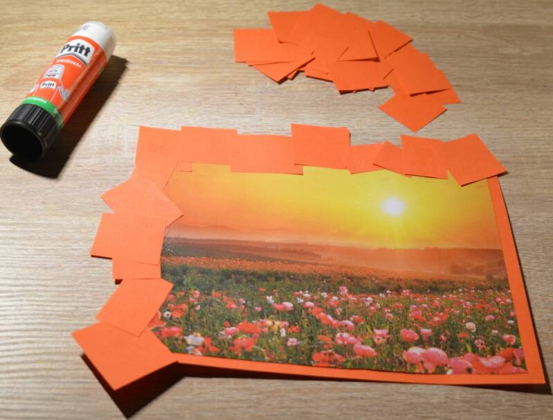 Stap4: Plak de vlakjes aan de rand van de foto. Je mag ook zeker een klein beetje over de foto plakken. Doe dit aan alle zijden van de foto.