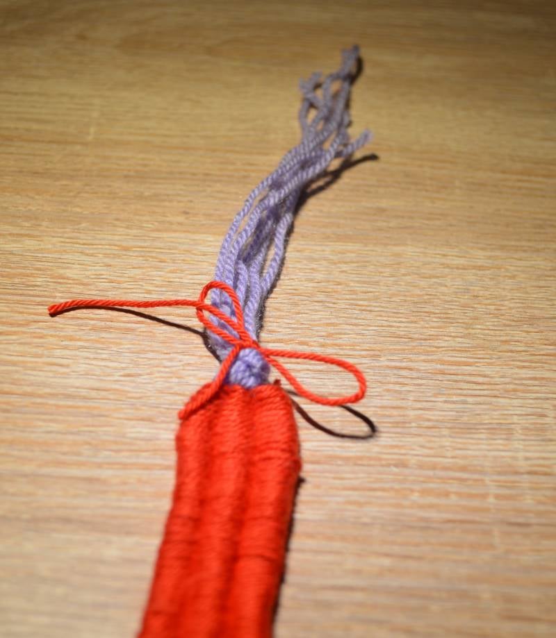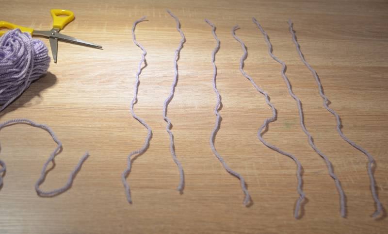 Stap1: Knip van één kleur wol 6 even lange draden.