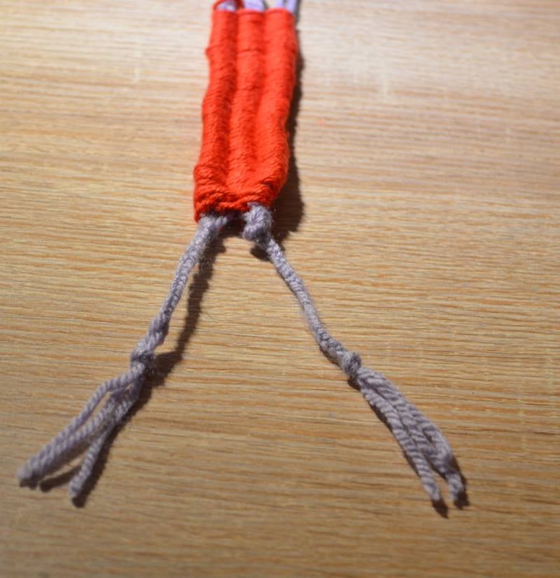 Stap3: Weef met de andere kleur draad het lijfje van het poppetje.