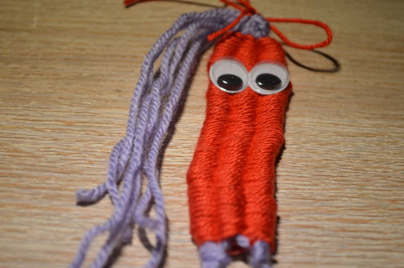 Stap7: Om het haar van je poppetje wat op te vrolijken kun je er met een gekleurd touwtje een strikje om maken.