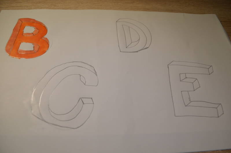 Stap3: Verbind de uiteindes van de streepjes met elkaar door de lijnen van de letter te volgen. Zo krijg je het 3D - effect.