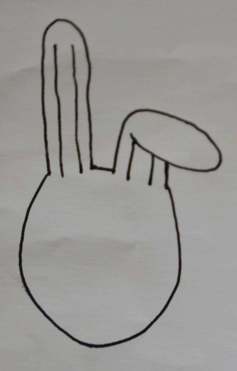 Stap2: Aan het linker uiteinde van het bakje teken je een lange, smalle boog.