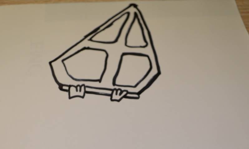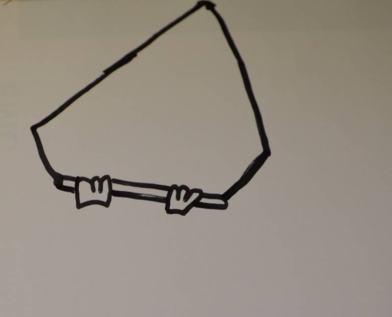 Stap3: De mijter teken je door eerst aan elke kant van de rechthoek een korte, schuine lijn naar buiten te tekenen. En vervolgens laat je de twee lijnen samen lopen in een puntvorm.