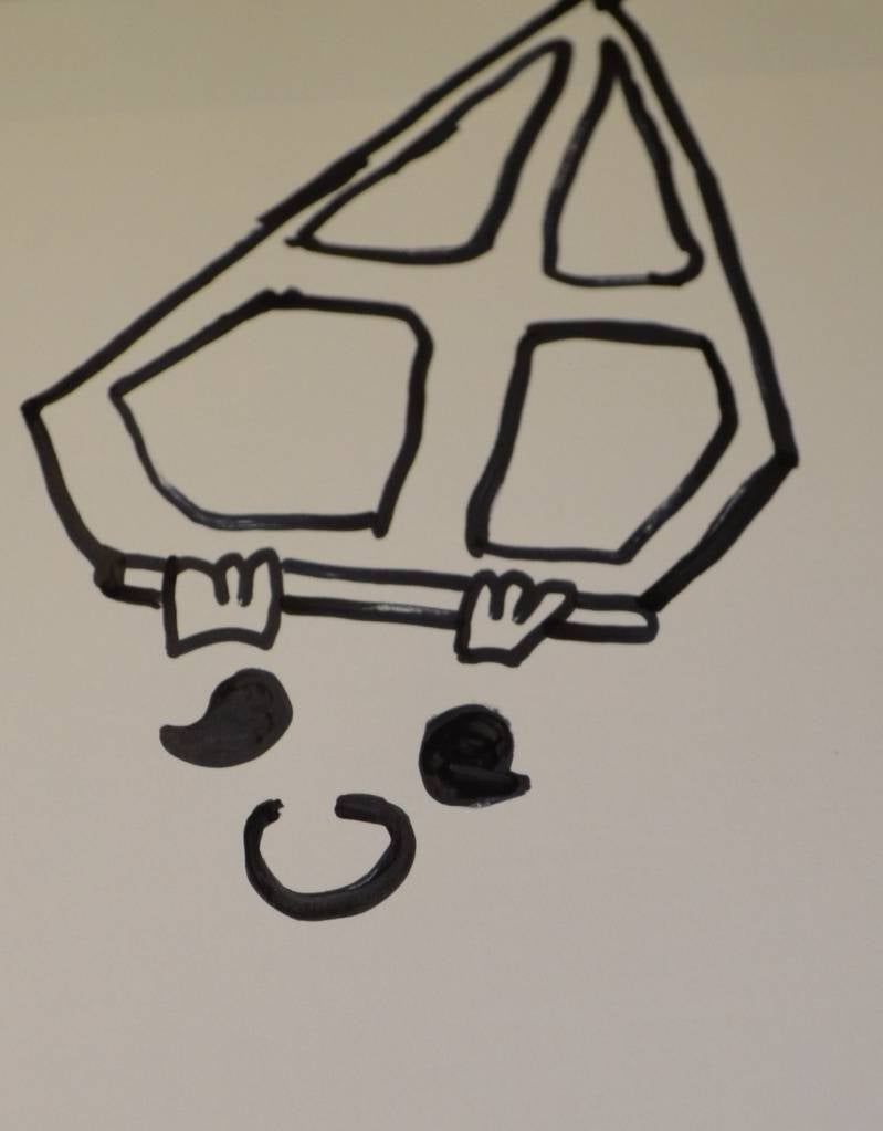 Stap6: Onder de wenkbrauwen teken je de ogen. Deze oogjes teken je door eerst een bolletje te teken en er een soort driehoekje aan te maken.