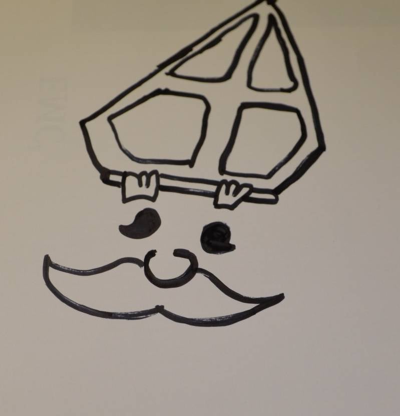 Stap9: Teken twee gebogen lijnen van de mijter tot aan de snor. Zo ontstaat het gezicht van de Sint.