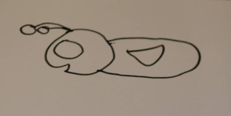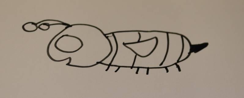 Stap5: In het lijfje teken je een driehoekje met één punt naar het hoofdje gericht. Dit is de vleugel.