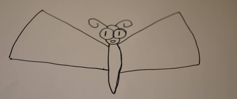 Stap9: De onderste vleugels teken je door langs elke kant van het lijfje een soort halve maan te tekenen die achter de bovenste vleugel verdwijnt.