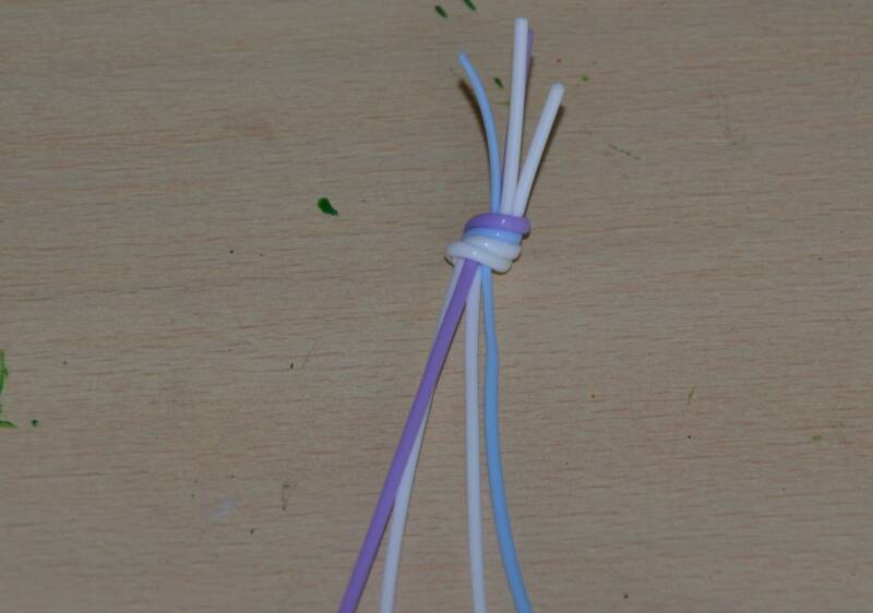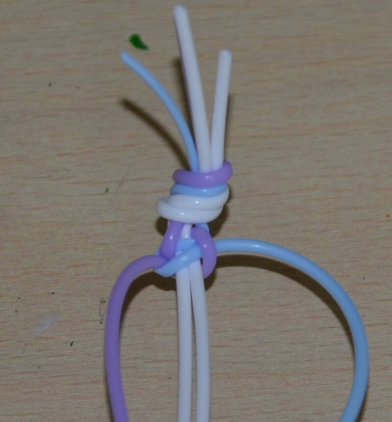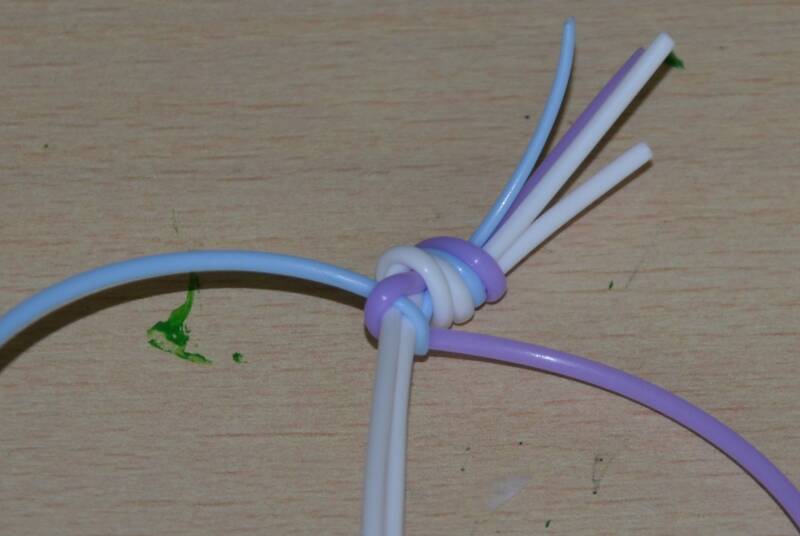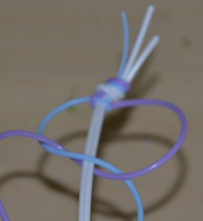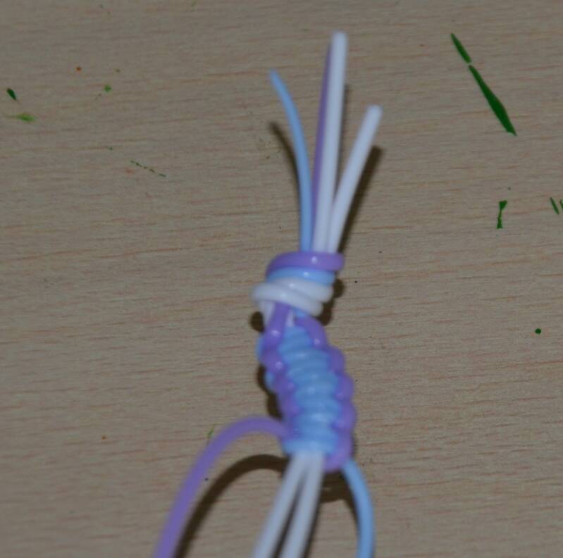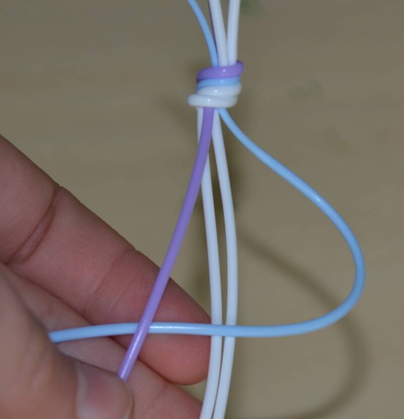 Stap2: De blauwe draad haal je over de twee witte draden en achter de paarse draad.