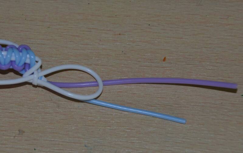 Stap6: De blauwe draad leg je over de witte draden en steek nu de blauwe draad door de paarse lus.