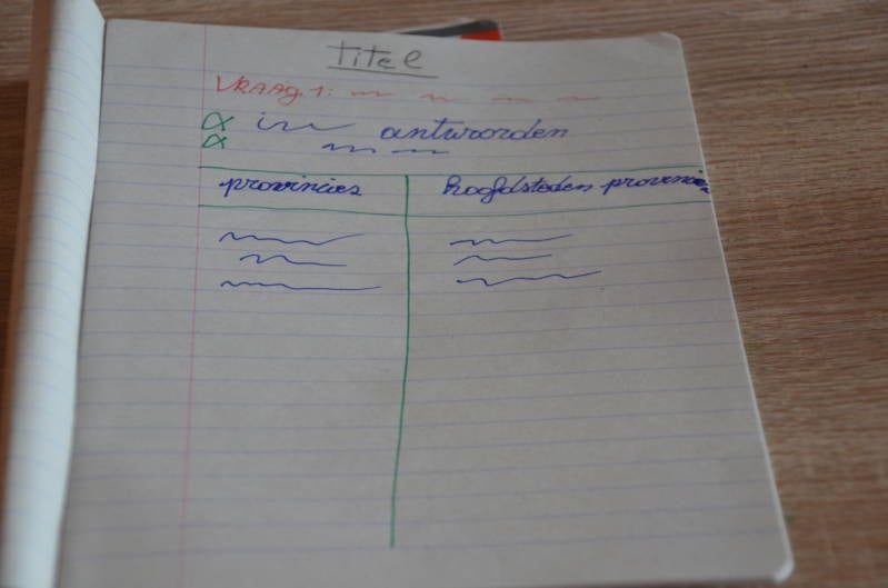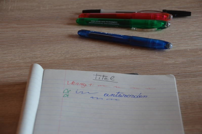 Zo kun je de titel van de les in het zwart doen, de vragen in het rood en de antwoorden in het blauw om alles duidelijker te maken. Een voorbeeld hiervan kun je op de foto hier onder bekijken.